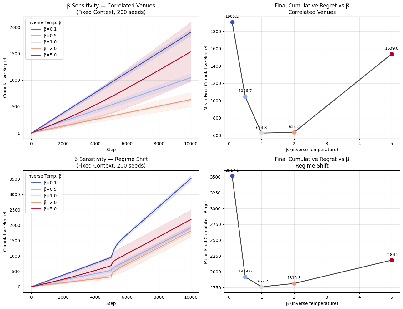 • The Optimality Sweet-Spot: The most efficient inference is achieved around \(\beta=1.0\) to \(\beta=2.0\). In dynamic environments like the Regime Shift scenario, overly deterministic exploitation resulting from excessive “cold” states (e.g., \(\beta=5.0\)) actually degrades performance (increasing regret to ~2184), because distributions that are excessively sharp prevent optimal exploration and adaptivity trailing market disruptions.