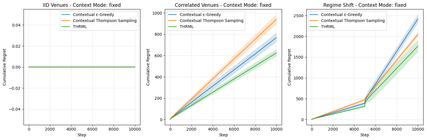 1. Context-Specific Performance: THRML outperformed the Contextual \(\epsilon\)-Greedy and Thompson Sampling baselines in both modes. In Fixed mode, THRML achieved a lower regret (6738.68 vs 7002.17 for CTS). In Random mode, THRML demonstrated materially higher robustness, with a 39.7% reduction in regret (4901.35) compared to the best baseline (8134.47).