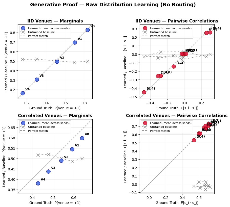 Generative Proof: Raw Distribution Learning (No Routing): Comparison of learned vs. ground truth marginals and pairwise correlations for IID and Correlated venue scenarios.